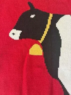 Vintage 80s J.G. Hook Red Knit Cow Graphic Short Sleeve Sweater, Size Medium. This unique piece features a bold intarsia-knit cow graphic with a yellow bell detail. Made of 100% cotton, it offers a comfortable and breathable fit.