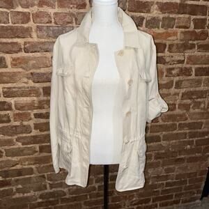 Classic Robert Kitchen 100% linen utility jacket / safari style shirt jacket in a versatile cream / ivory color. This lightweight jacket is breathable and perfect for spring, summer travel, or casual layering.