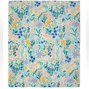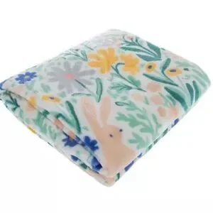 Floral & Bunny Plush Throw Blanket - White, Green, Yellow