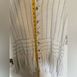 Cream tunic with vertical blue stripes. Button-front closure with wooden-look buttons. Ruffled peplum hem and relaxed fit. Three-quarter sleeves for easy wear.
