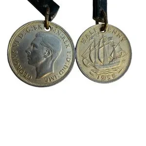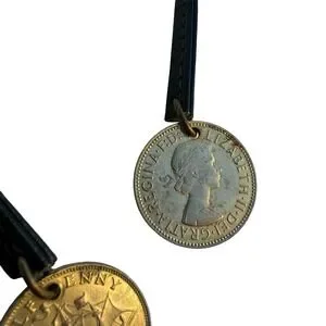 Keywords: Coin Jewelry, British History, George VI, Elizabeth II, Boho, Steampunk, Nautical, Ship, Half Penny, Leather Choker, Lariat Necklace, Vintage Style, Anglophile, Eclectic, Statement Piece