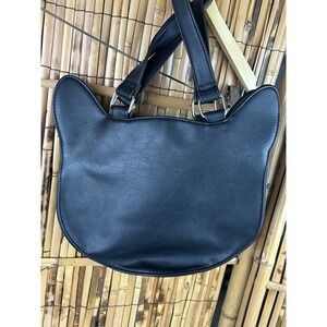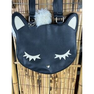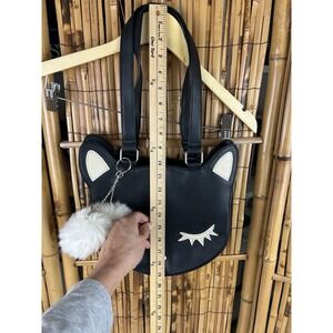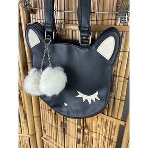 Cute Cat Face Vegan Leather Tote Bag Purse With White Pom Poms. Condition is Pre-owned - Excellent. Shipped with USPS Ground Advantage.
