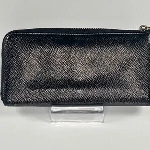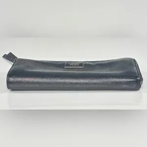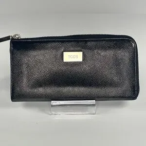Sleek black textured leather zip wallet by TODS. Silver hardware and zipper. Compact and stylish. Clean, modern look for everyday use.