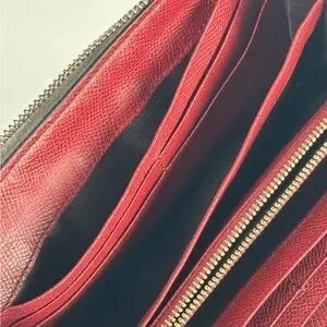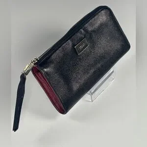 TODS Black Textured Leather corner Zip Wallet. Red interior. S