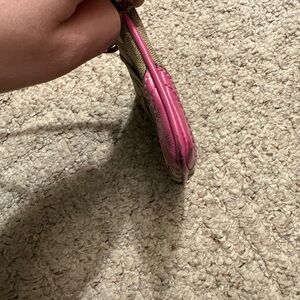 Compact Coach wristlet in khaki signature canvas with hot pink leather trim and strap. Secure zip closure and detachable wrist strap for easy carrying. Sleek design perfect for cards, cash, and essentials. Stylish khaki and pink colorway adds a pop to any outfit.