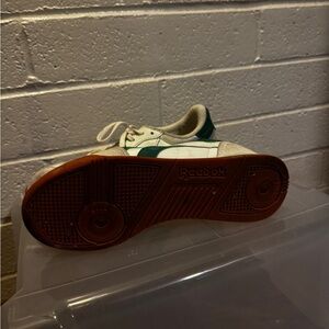 Retro low-top Reebok sneakers in white with green accents. Suede and leather panels with lace-up closure. Gum rubber outsole for grip and style. Casual design for everyday wear.