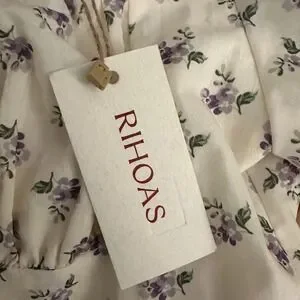 Beautiful RIHOAS cottagecore floral midi dress featuring a soft cream base with delicate purple flowers throughout.