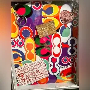 Vibrant multicolored Coach 'C' lighted picture frame handmade. Includes metallic gold poppy creed and pink, red and silver poppy hangtags. Assorted circular and tag-style decals. Brighten up walls, posh rooms or display in home.
