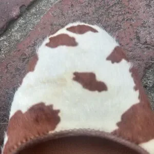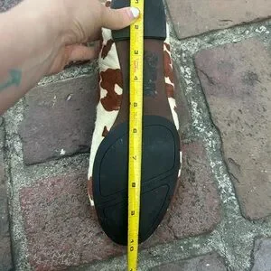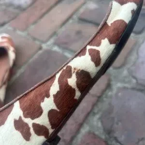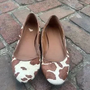 Vintage Nine West ballet flats. There’s some wear in the inside as well as some small wear spots in the pony hair as shown in pictures. There also is a tiny discoloration on one on the top but very hard to notice. Classic round-toe silhouette pairs easily with casual and dressy looks. Brown and white colorway adds a bold, on-trend touch. It looks more like a 9 to me but I’m not sure. So I took the measurement in photo