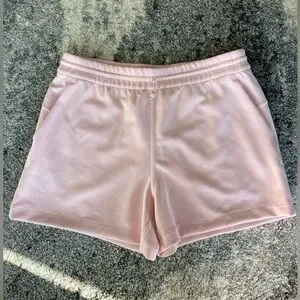 Lightweight athletic shorts in pale pink. Elastic waistband with drawcord for a secure fit. Smooth fabric with a clean hemline. Side pockets for convenience. Easy styling for workouts or casual wear.