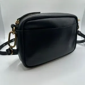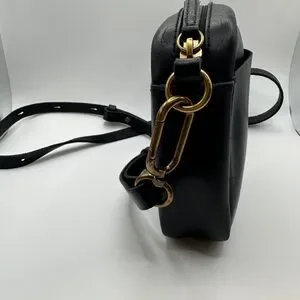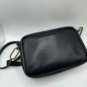 Sleek black leather crossbody with gold-tone hardware. Leather carabiner medium crossbody bag. Designed for everyday use with a minimalist silhouette. Comfortable adjustable strap for hands-free wear. Clean exterior pocket for quick access. Versatile style that pairs well with any outfit.