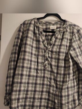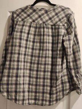 Lightweight plaid henley shirt with a relaxed silhouette. Button-front placket and subtle v-neck. Soft woven texture for casual wear. Long sleeves with rolled-cuff option. Size extra large excellent pre-owned condition. Smoke free home.