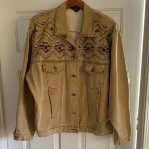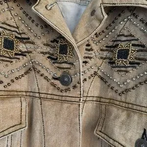 Stylish SZ 12 woman’s tan jacket featuring intricate beading. Perfect for adding a touch of elegance to any outfit.