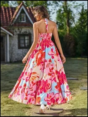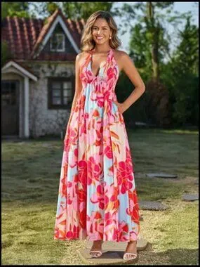 A flowy, lightweight A-line dress designed for comfortable wear during casual outings, beach vacations, or summer events. Features a flattering V-neck and halter tie back with convenient side pockets for a stylish and practical silhouette.