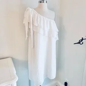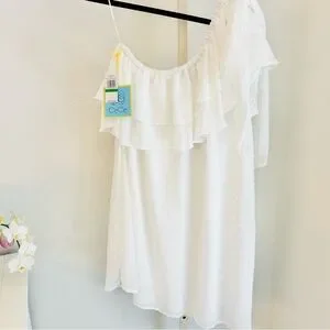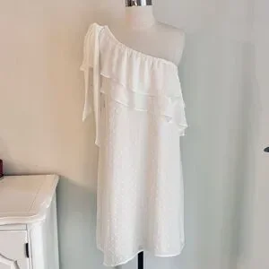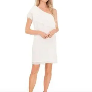 LAST CHANCE; CeCe White One Shoulder Chiffon Swiss Dot Dress, Large, NWT