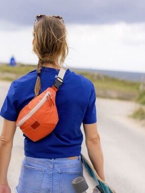 orange waist pack with adjustable cream strap. Lightweight, water-resistant fabric for everyday wear. Easy-access zip pocket and secure buckle closure. Stylish orange color adds bold accent to casual outfits.