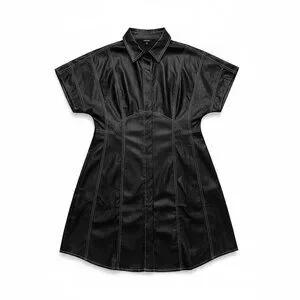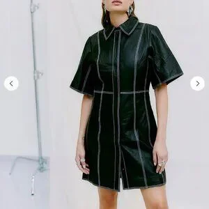 Chic black faux leather mini dress by THML, featuring striking contrast white stitching and a structured A-line silhouette. Designed with a pointed collar, short sleeves, and tailored panel detailing for a modern, elevated look.