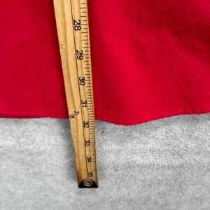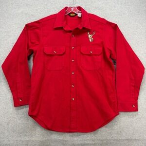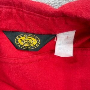 Woolrich Classic flannel shirt in a vibrant red features a detailed buck deer head embroidery on the chest, perfect for outdoor enthusiasts. Crafted from soft 100% cotton, this long-sleeve button-down includes dual button-flap chest pockets and a structured collar for a rugged yet clean look. The heavy-duty fabric provides warmth and durability for hunting, camping, or casual everyday wear. This garment is in good pre-owned condition with pilling on fabric.