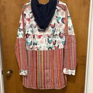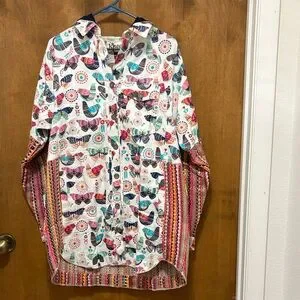long-sleeve button-up hooded shirt with vibrant butterfly and geometric prints. Lightweight, breathable fabric with a bright white base and multi-colored pattern. Stylish collar and chest pocket for a casual, playful look. Easy to pair with jeans or chinos for everyday wear. 100% Cotton ,
