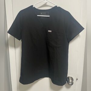 Classic V-neck scrub top from Figs. Short sleeves and single chest pocket. Sleek, professional solid black design. Lightweight stretch fabric for comfort and mobility.