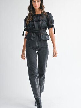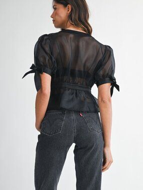 NWT Mable Black Aurelie Organza Bow Puff Short Sleeve Top