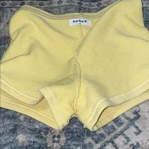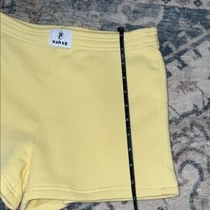 Cotton terry heritage mini Parke sweatshorts in a soft pale yellow. Smooth stretch fabric for easy movement. Elastic waistband for comfort. No signs of wear!