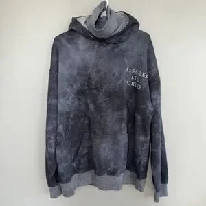 The Assholes Live Forever Gray Tie Dye Turtleneck Hoodie in unisex XL size is a stylish and comfortable streetwear piece perfect for any season. Made from a blend of polyester and cotton, this hoodie features a tie dye gray color with a regular fit and long sleeves. The turtleneck neckline add s a trendy touch, while the logo accents give it a unique flair. Whether you're walking or simply relaxing, this pullover hoodie with a hood and pocket is sure to be a versatile and fashionable addition to your wardrobe.