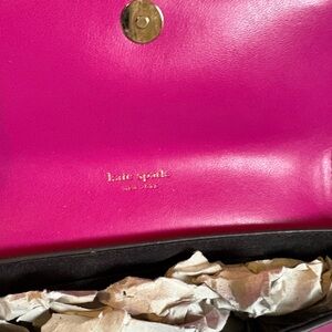 Sleek kate spade crossbody wallet in vivid bright pink. Front bow accent with metal stud detail. Detachable strap for versatile wear. Smooth leather finish and polished edges.