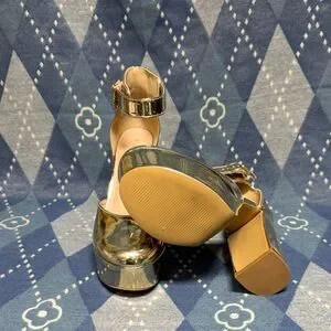 Striking gold platform heels with an adjustable ankle strap for a secure fit. Sleek metallic finish enhances outfits for nights out and special events. Cushioned insole provides comfort while the platform adds confident height. Versatile gold tone that pairs with many looks.