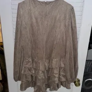 Fashion Nova dress with lace-up front. Long sleeves and tiered ruffle skirt. Suede-look textured fabric. Elegant neutral tone for versatile styling.
