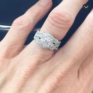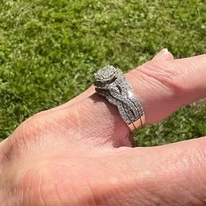 Sparkling pavé stones set in a twisted band. White gold finish offers high shine. Eye-catching design for dressy looks. Comfortable fit with layered sparkle. Bridal set, three rings that are sz 6.5 and sautered together with a karat wt 1.5, purchased from Kay Jewelers.