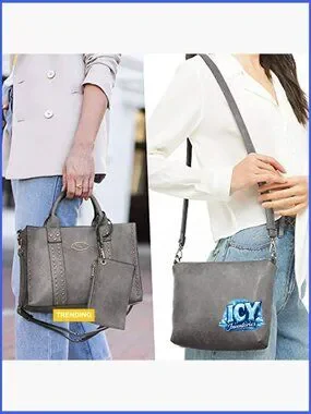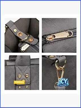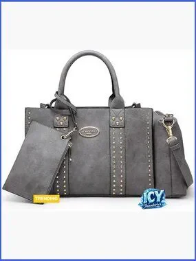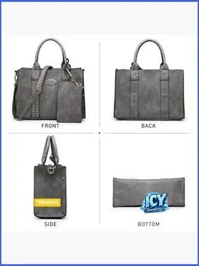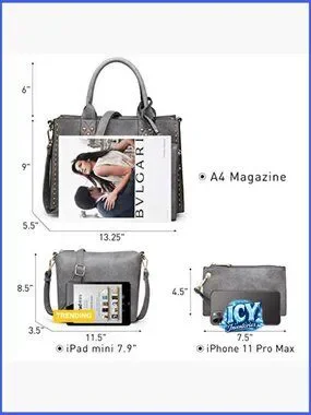 A complete three-piece set featuring a stylish satchel with stud accents, a matching crossbody cosmetic bag, and a convenient wristlet. Designed for versatility, offering ample space and organization for work, shopping, travel, and daily activities.