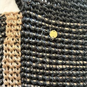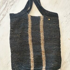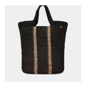 Handwoven black tote with two natural stripe details. Soft top handles for carrying. Spacious interior for daily essentials. Simple, versatile style for casual use.