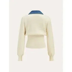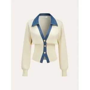 Discover this absolutely lovely NWT (New With Tags) Commense Women's Denim Collar V-Neck Knit Top, perfect for adding a touch of casual chic to your wardrobe! This top is brand new and ready to become a favorite. It features a stylish denim collar that beautifully contrasts with the soft knit body, offering a unique and modern look. The flattering V-neckline is complemented by elegant metal button detailing, adding a subtle sparkle.