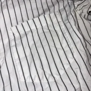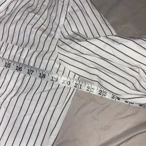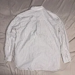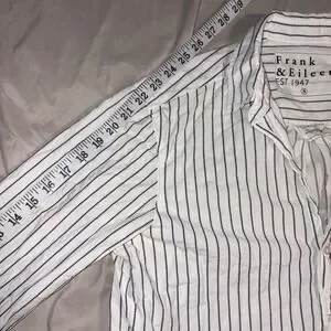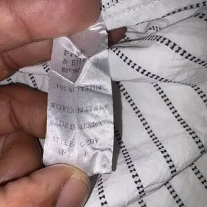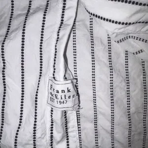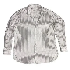 This FRANK & EILEEN Joely button-up shirt offers a timeless aesthetic with its crisp white cotton and delicate black dotted stripe pattern. Woven in Italy and crafted with meticulous attention to detail, it features a classic collar, a single chest pocket, and a relaxed yet refined silhouette that feels wonderful against the skin. Excellent preowned condition. Perfect for a professional day at the office, a casual brunch, or a weekend gallery stroll.