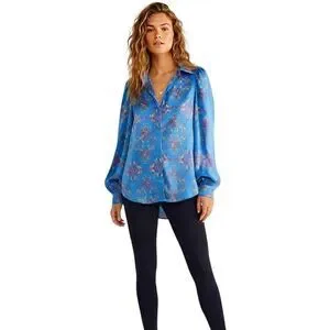 Olivaceous Womens Blouse Sz Small Satin Floral Button down Blue Spring Summer