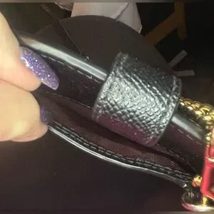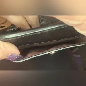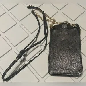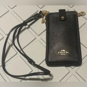 Coach branded leather phone crossbody. Black textured leather with gold foil logo and carriage emblem. Sleek, compact design for everyday use.