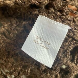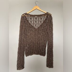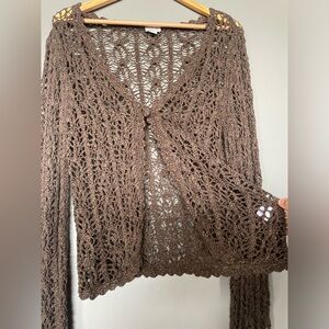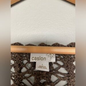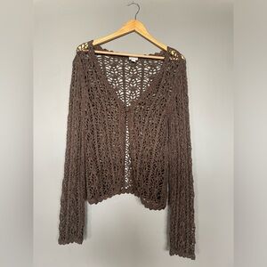 Caslon crochet V-neck sweater in rich brown. Open-front design for easy layering. Delicate knit creates a breathable, textured look. Lightweight and versatile for casual outfits. Size L