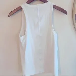 Classic white ribbed tank top with a crewneck design. Lightweight and breathable for everyday wear. Smooth stretch fabric for a flattering fit. Easy to pair with jeans or layered looks. White color adds versatile wardrobe basics.
