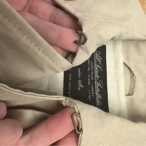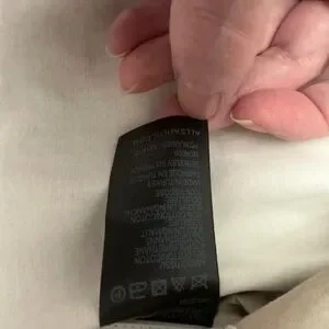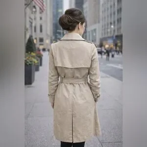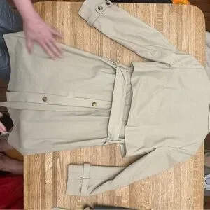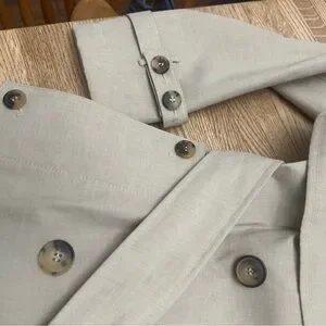 This coat has the most beautiful feel to the fabric, a lightly starched feel, lovely darting and button flaps, belted button straps at wrists, buckled belt, back shoulder flap. Buttoned pockets. It’s just beautiful and of such high quality like Burberry, a classic but a bit updated. Taped seams like you’d expect of a quality garment. Fully lined.