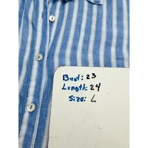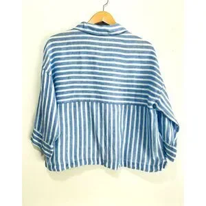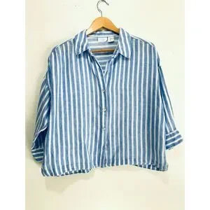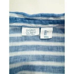 Sigrid Olsen 100% linen crop button up shirt blue stripe coastal beach women L