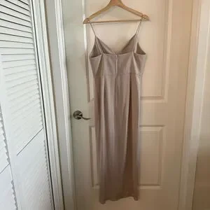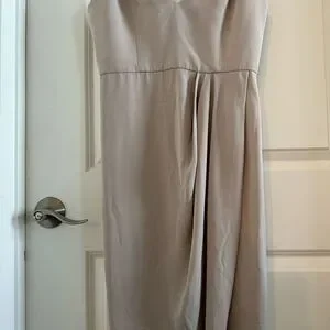 Shona Joy Cocktail Draped Dress size 8. Color is kind of a grey/beige/taupe in my opinion. Midi dress with draped skirt and tulip hemline. V neck front with thin straps and back zip closure. Perfect for bridesmaids, prom or formal, or even just date night! In great condition.