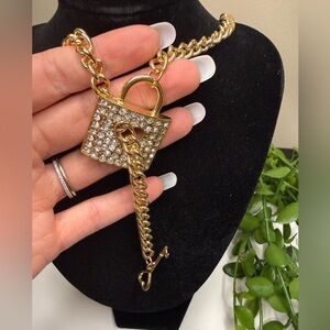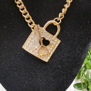 Gold-tone chain necklace. Pave crystal padlock pendant. Bold, on-trend accessory. Easy to style with day or night looks.