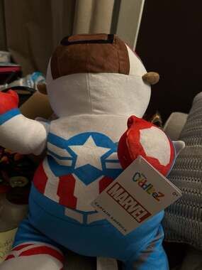Disney Marvel Cuddleez Captain America Plush - Brand New with Tags. This super soft and squishy large plush features Captain America in his iconic red, white, and blue suit with star detailing. Designed to be a weighted laying pillow or a snuggly companion for Marvel fans of all ages. High-quality construction and vibrant colors. Perfect for superhero bedroom decor or as a gift for collectors. Excellent condition, never used.
