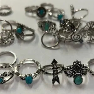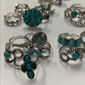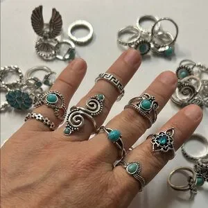 Set of silver-tone bohemian rings featuring turquoise accents. Versatile stackable designs with floral, swirl and geometric details. Lightweight and stylish for everyday wear. Includes multiple turquoise-colored rings for layered looks.