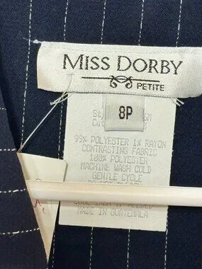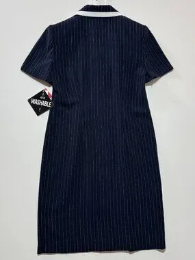 The Vintage Miss Dorby Navy Pinstripe Button Collared Midi Dress in size 8P is a stylish and versatile piece suitable for various occasions. With its classic striped pattern, collared neckline, and button closure, this dress exudes a timeless elegance. Made from polyester with a rayon fabric type, it is easy to care for with machine washable instructions. The midi length and short sleeves make it ideal for the seasons of summer, fall, and spring, while the accent of button detailing adds a touch of sophistication. Perfect for casual outings, formal events, workwear, or business meetings, this dress is a must-have for any woman's wardrobe.