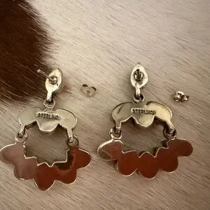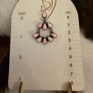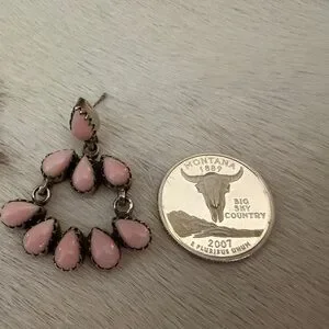 These striking queen pink conch statement earrings feature nine teardrop-shaped stones in each earring, arranged in a graceful chandelier-style cluster that creates a soft, petal-like silhouette. The creamy blush pink conch shells are bezel-set in sterling silver with a lightly oxidized finish, adding depth and contrast that highlights the handcrafted detail of each setting. The tiered design allows for gentle movement, giving the earrings a lively, dimensional feel while maintaining an elegant balance. Measuring 1.57”L x 1.24”W x .24”D and weighing a combined 20.4 grams, these earrings make a bold yet feminine statement—perfect for adding a touch of Southwestern artistry and refined color to any look.
