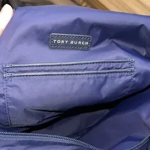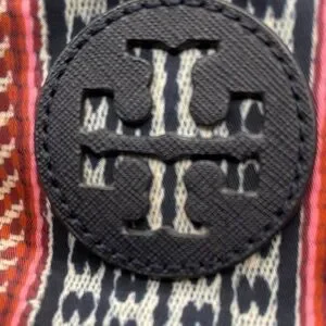 Tory Burch nylon tote with navy and red pattern. Features signature logo detail. Ideal for everyday use. Fun grab and go bag.