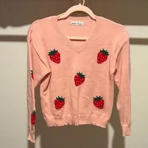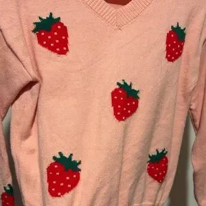 Lightweight pink V-neck knit sweater. Red strawberry intarsia with green leaves. Casual fit and soft texture. Cute, playful design for everyday wear.
