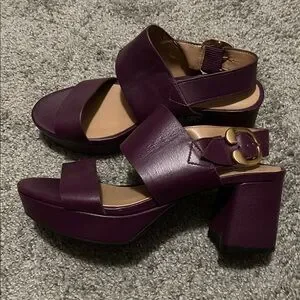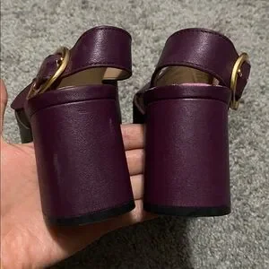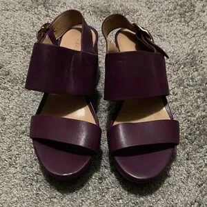 Smooth leather upper with two wide straps. Padded footbed for comfort. Adjustable slingback buckle for a secure fit. Versatile deep purple shade for day or night wear.